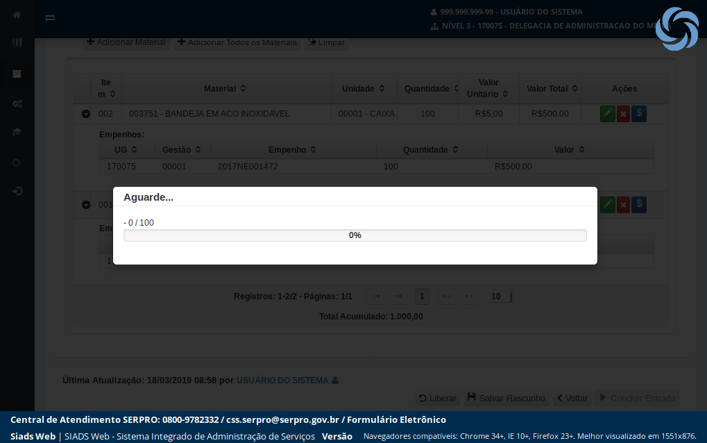 Após acionar o botão "Sim" o sistema apresentará uma tela de progresso para gerar o documento hábil no SIAFI, atualiza o saldo e os dados de estoque no SIADS.