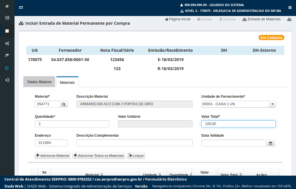 Após informarmos os dados básicos da entrada de materiais precisamos adicionar os materiais. Para isto