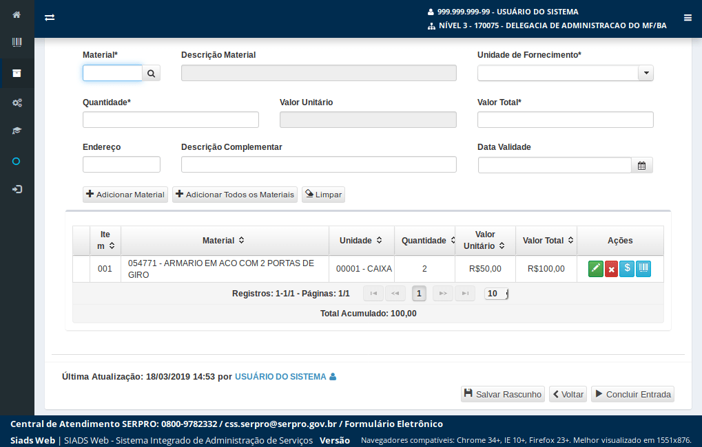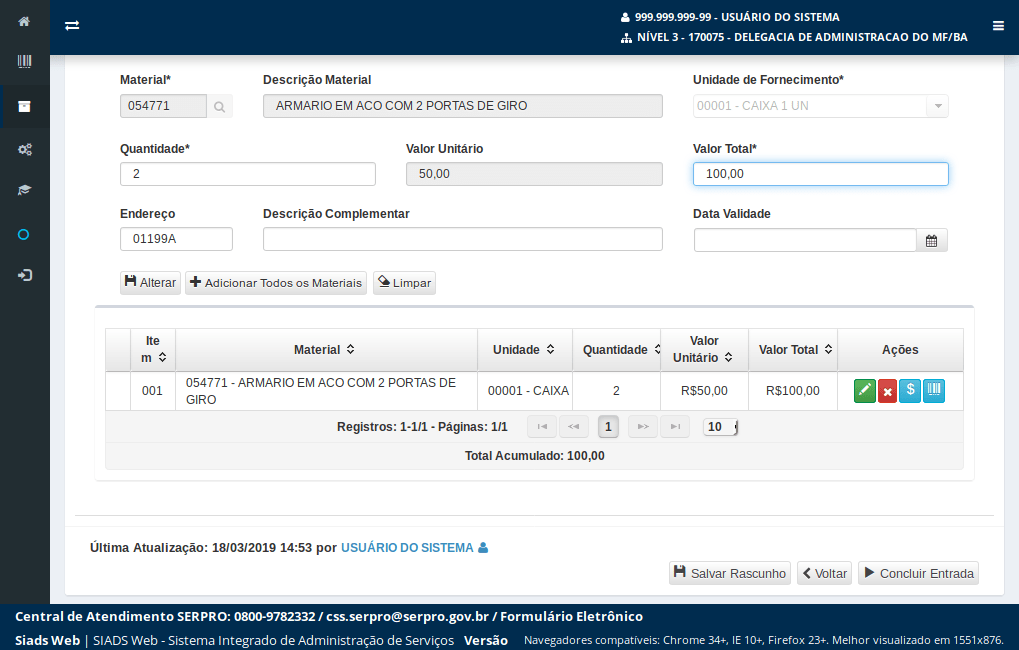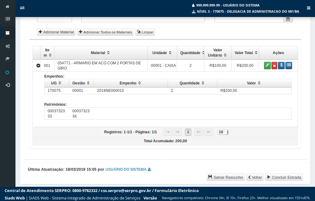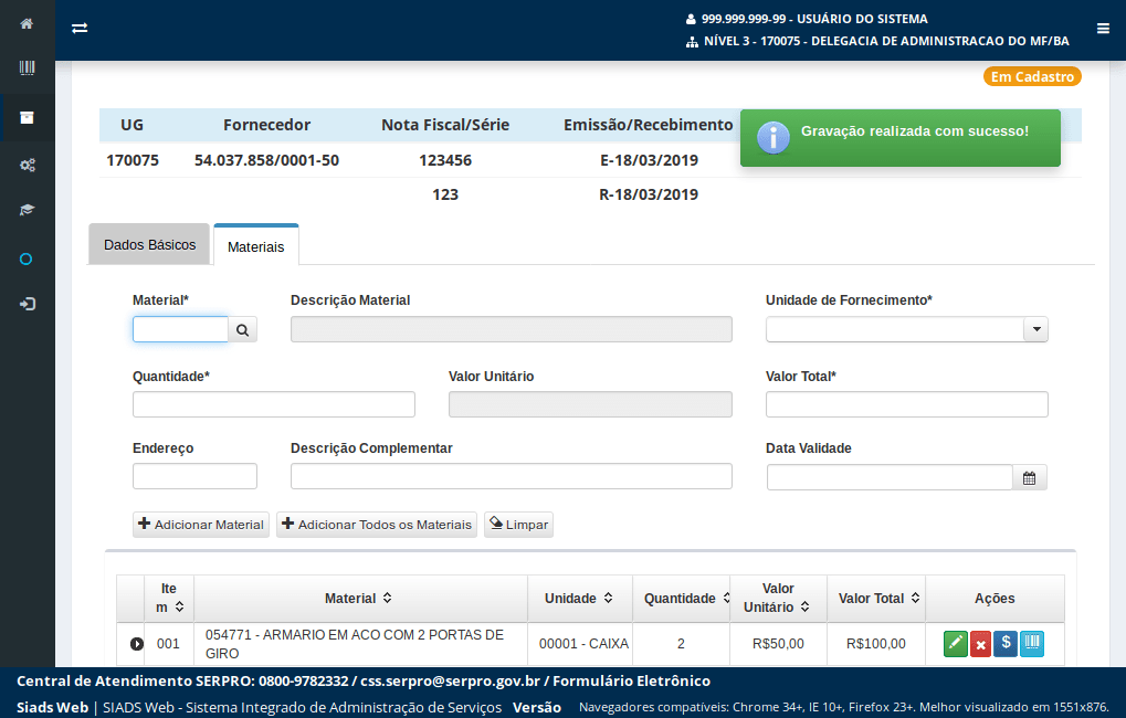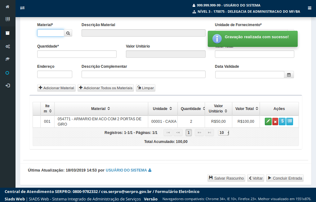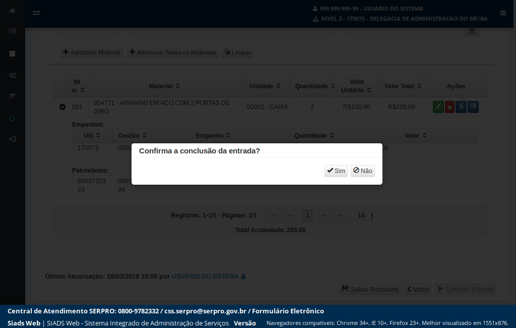 Após a visualização que todos os dados estão corretos, poderemos concluir a entrada de materiais. Para isto