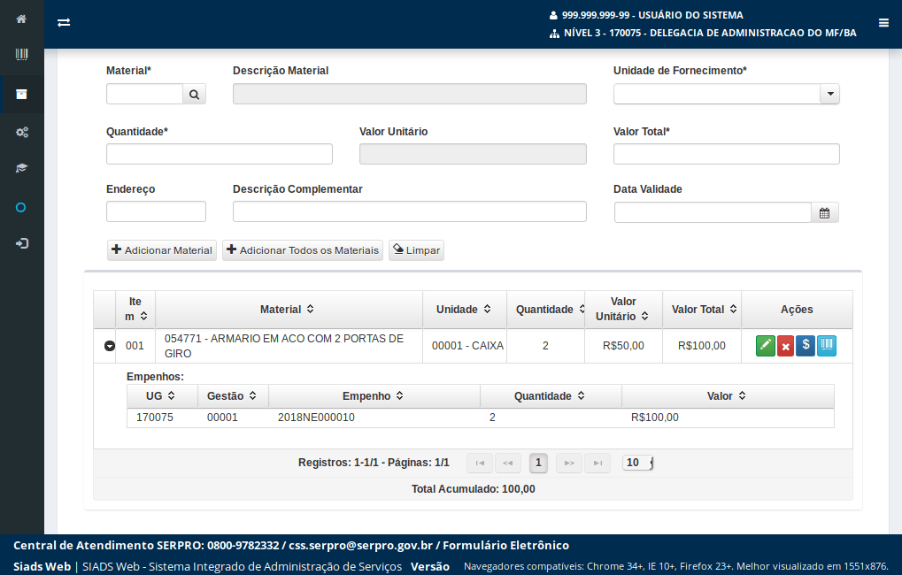 O sistema exibirá um botão para detalhar o registro de material adicionado. Para isto