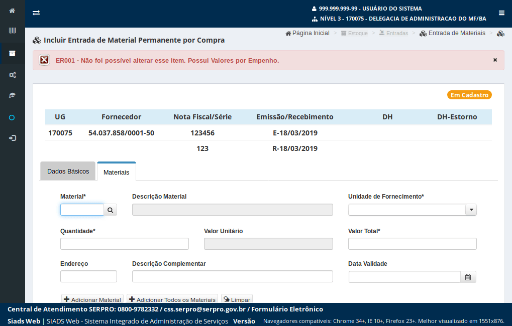 O sistema irá apresentar uma mensagem de erro pois o item de material possui valores relacionados a algum empenho.